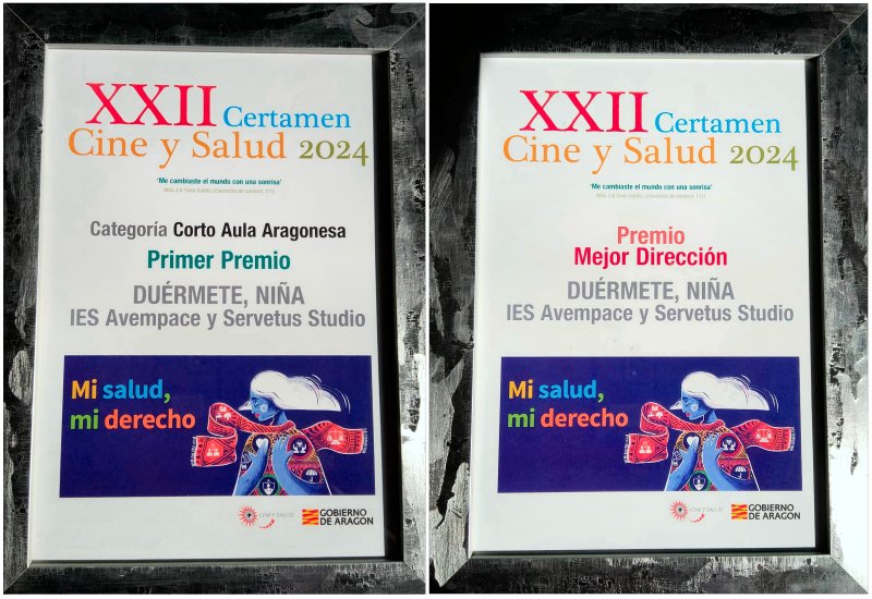 El cortometraje de Servetus Studio® y el IES Avempace, "DUÉRMETE NIÑA", ha recibido el primer premio de su categoría y el premio a la mejor dirección en el XII Certamen de cortometrjaes de Cine y Salud, celebrado el 13 de Abril en el salón Aragón del Patio de laInfanta.